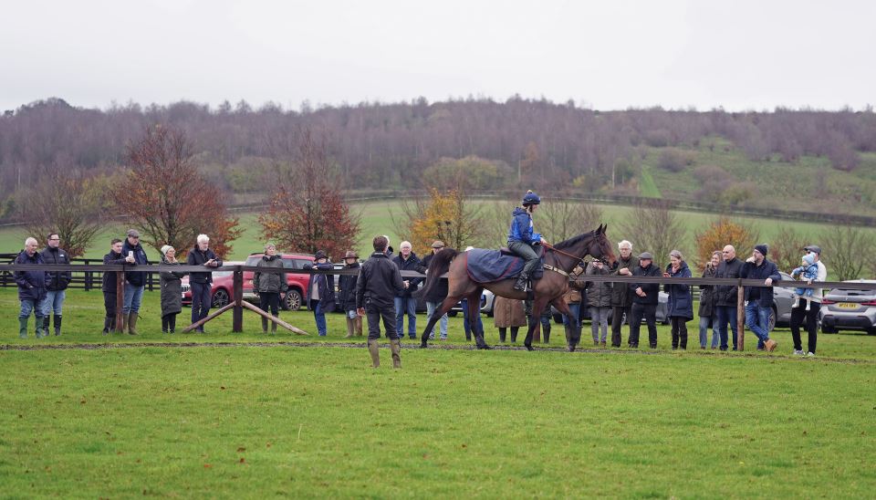 After watching these four at exercise, it was back to the yard, for a hot drink, lovely warm pastries, Claires cake and then time for everyone to have a wander around the yard. Despite the forecast, the rain just about held off, and it was a fun morning. As we were drinking coffee and eating pastries and cakes, And She Was headed out for her mornings work – she did two routine canters up Sharpridge and is in good form.