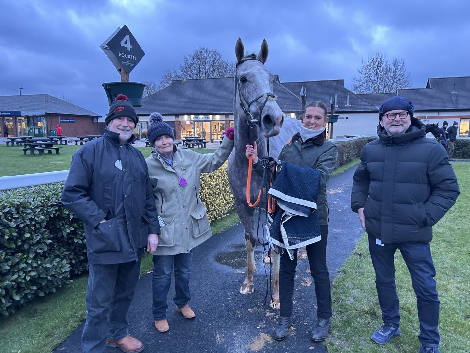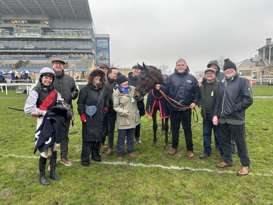 Thursday – the all too familiar trip up the A1 to Doncaster. A good turn out of MOLLY’S LAD’s owners there to see him make his hurdles debut. Oversubscribed for badges – but thanks to Doanld (who’s allocation I borrowed a few off) everyone in the O&T’s with lunch. I thought Carlisle was cold on Tuesday – Donny equally Baltic! With added sleet and snow! The ground certainly nothing like the ground given – it was soft – which was no bad thing. ML taking on two smart prospects from top yards – but with Fern O’Brien taking off a valuable 5lbs both the previous winners would have to be conceding plenty of weight to him. Fern the obvious jockey booking, with Johnny in Huntingdon – she has done a lot of work with ML and had earned the ride after putting up with his antics when he first arrived at Ravenswell. ML took all the prelims in his stride and was relaxed in the paddock. Fern’s plan to get a lead, get him popping away over the first few and ride a race from turning in. It all went to plan – ML excellent as expected over the first, and with hurdles in front of him he actually engaged his brain and was not dossing about as he had in both of his bumpers. By the time he had jumped the next he had jumped his way into a share of the lead, and Fern had to just take a pull to sit in second. As planned they started to race as they straightened for home and it was very quickly apparent that the race only involved the front 3 who were pulling miles clear – ML jumped great all the way – but in the end he just couldn’t stick with the two in front of him and he finished third (with just the 62 lengths back to the 4th). This was an excellent start to his hurdling career. He had jumped really well and had put it up to two very talented horses that had already shown a decent level of form and won over hurdles. We were all delighted!